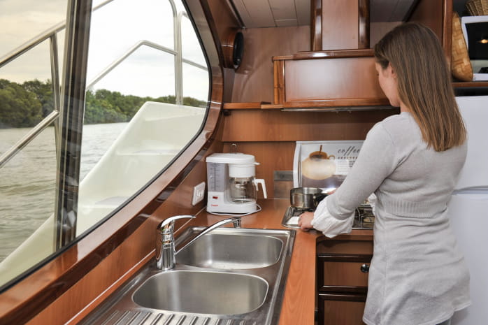 À bord, on trouve une cuisine équipée, des cabines avec lits simples ou doubles, un coin repas ou salon éventuellement transformable pour la nuit, des WC marins, douches, lavabos, du chauffage. Faits au départ, les pleins de carburant et de gaz suffisent généralement pour une croisière d’une semaine. Pour l’eau, il faut faire le plein tous les 2 jours environ.