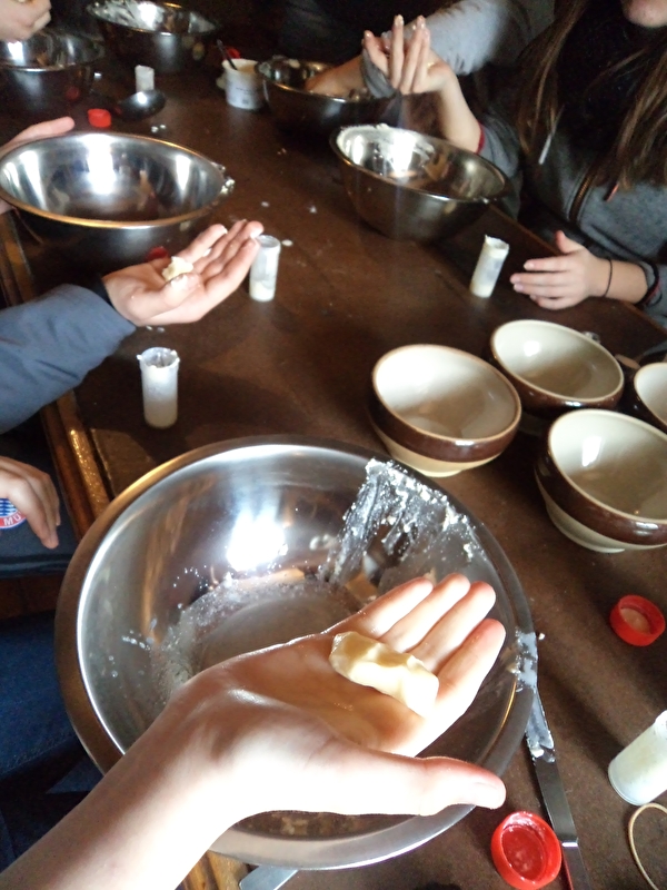 Après une visite de l’écurie et de la cave à fromage, les élèves fabriquent du beurre et le dégustent avec le pain de l’Écomusée !