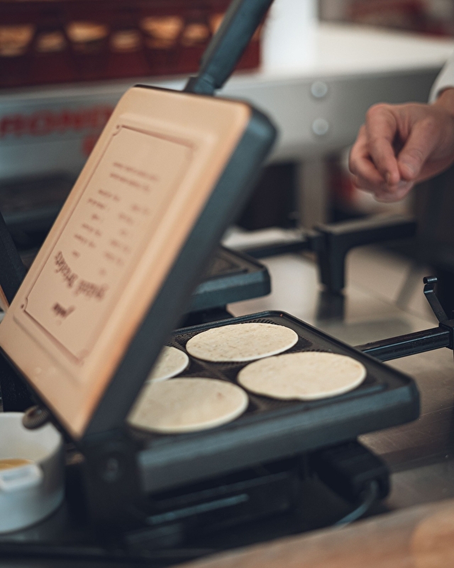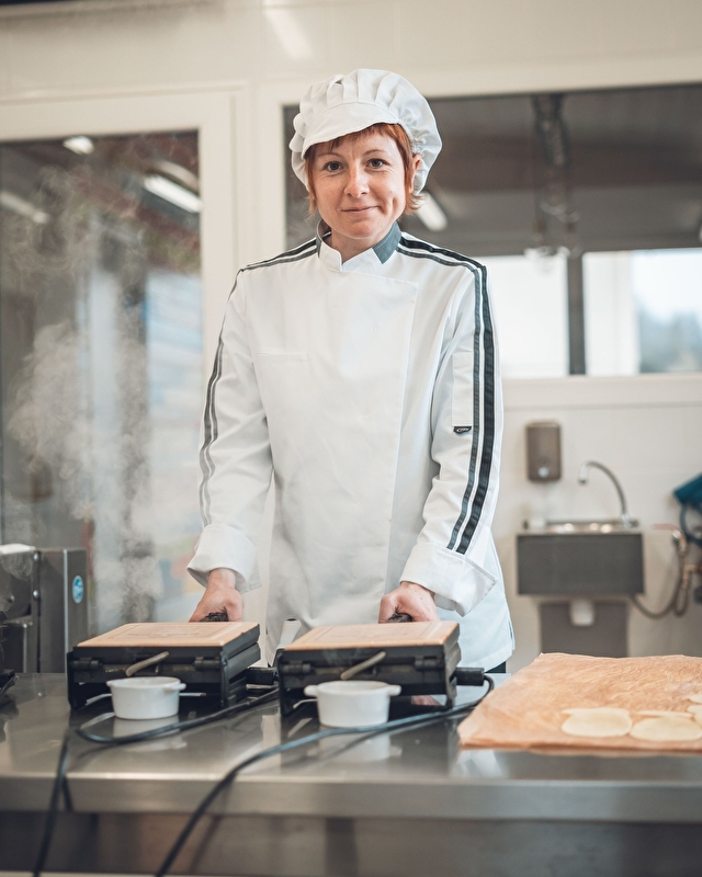 Aujourd'hui, elle façonne ces biscuits d'origine suisse entièrement à la main dans d'authentiques fers à bricelets Suisse selon la tradition.