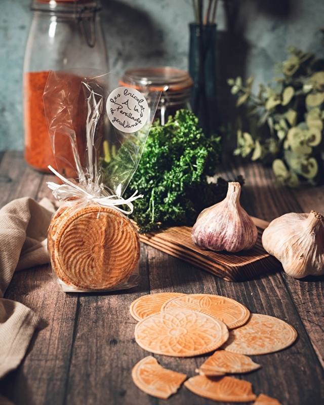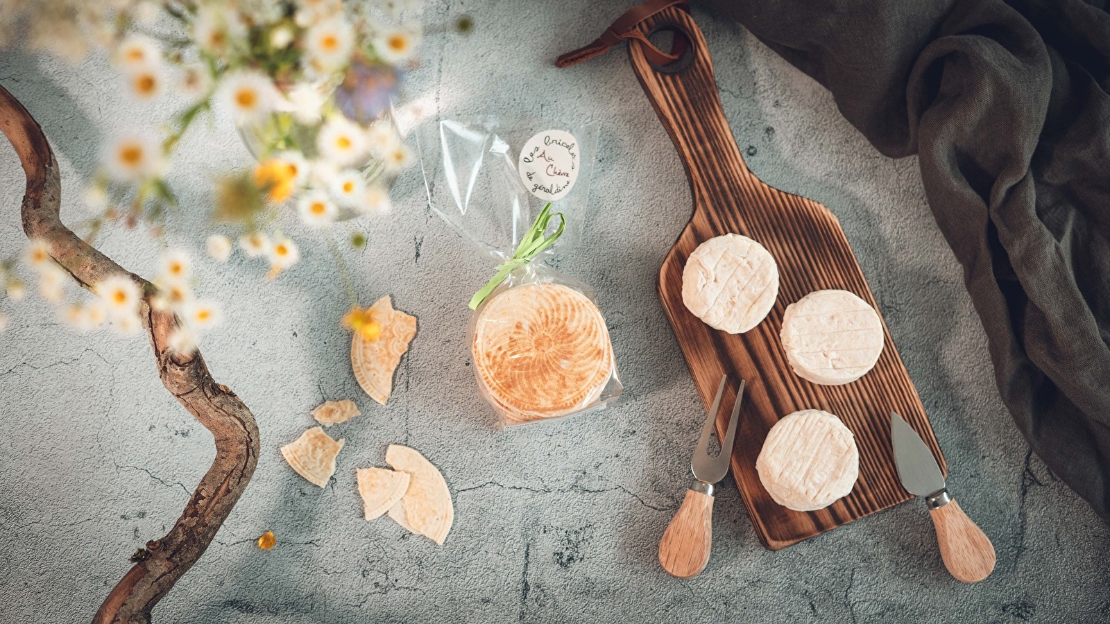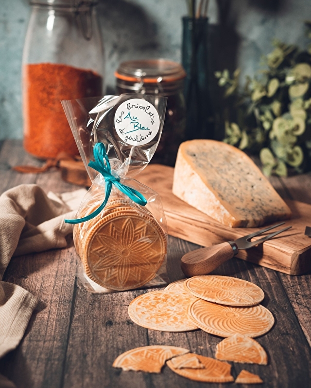 > Une gamme apéritive de bricelets salés est également proposée : comté, persillade, olives de Nyons, chèvre, Bleu de Gex, Piment de Bresse.