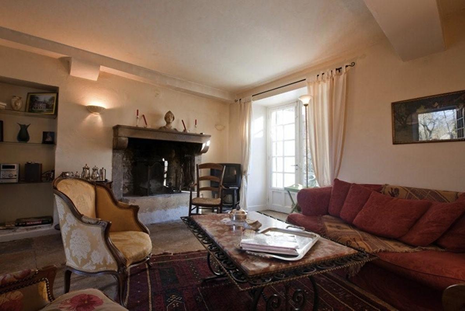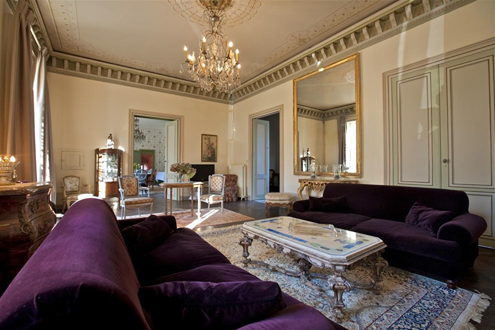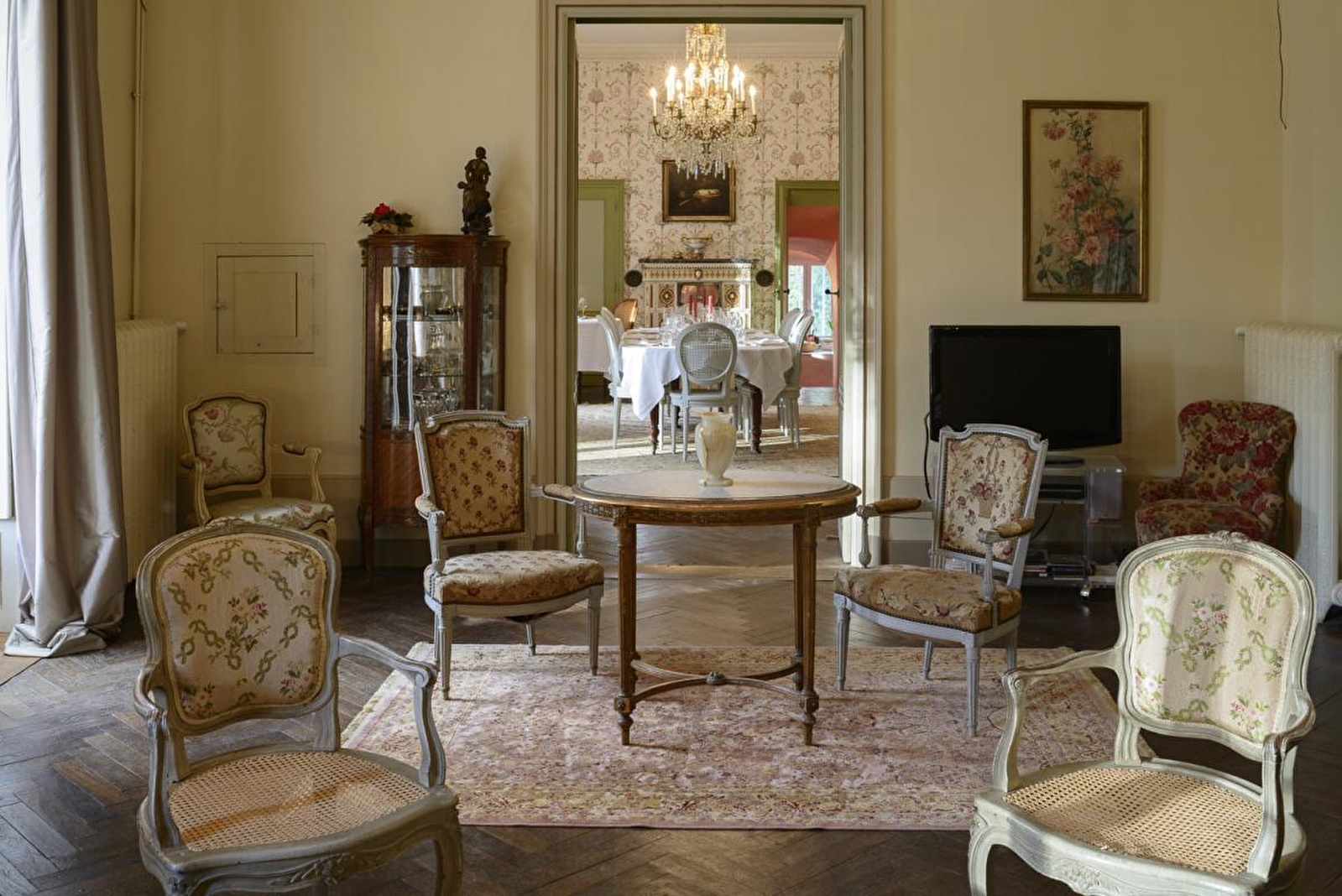 Le salon, baigné de lumière, est une invitation à la détente, un lieu de rencontre conjuguant élégance et intimité. De chaque côté de sa cheminée en marbre, vous accéderez à la bibliothèque où se trouve un piano à queue. Un grand vitrail laisse entrer le soleil.