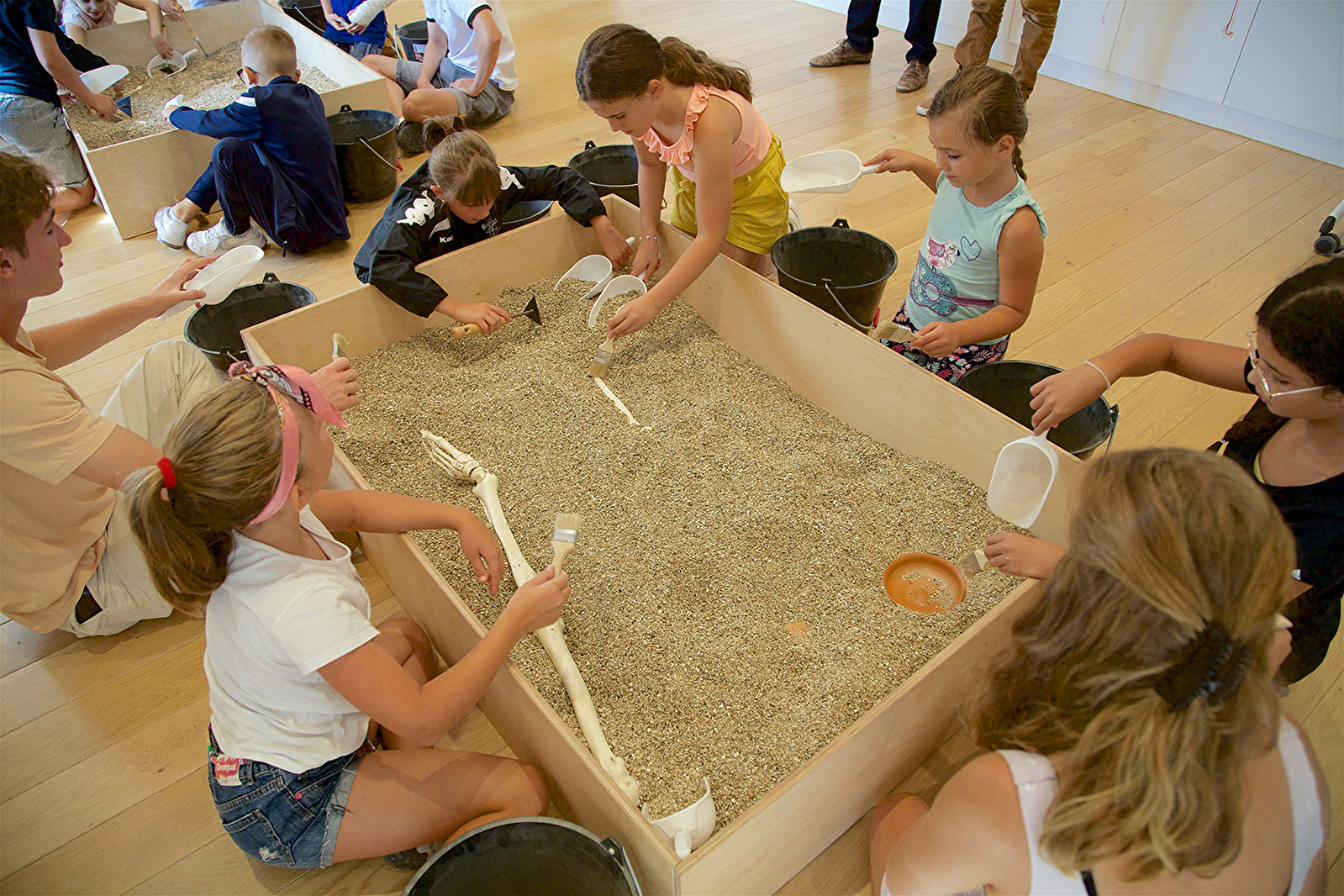• En salle pédagogique, les enfants s’initient à l’archéologie, à ses métiers et découvrent les outils des professionnels.