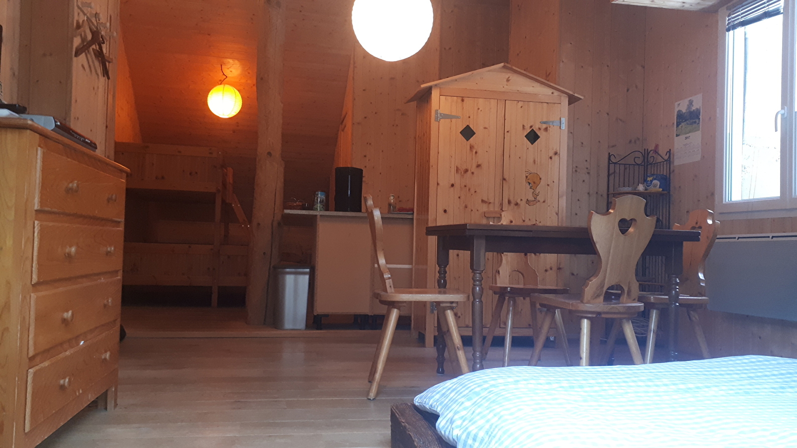 Studio tout en bois de 33 m2 environ. Belle vue sur parc d'épicéas. Accès par porte de grange et escalier.