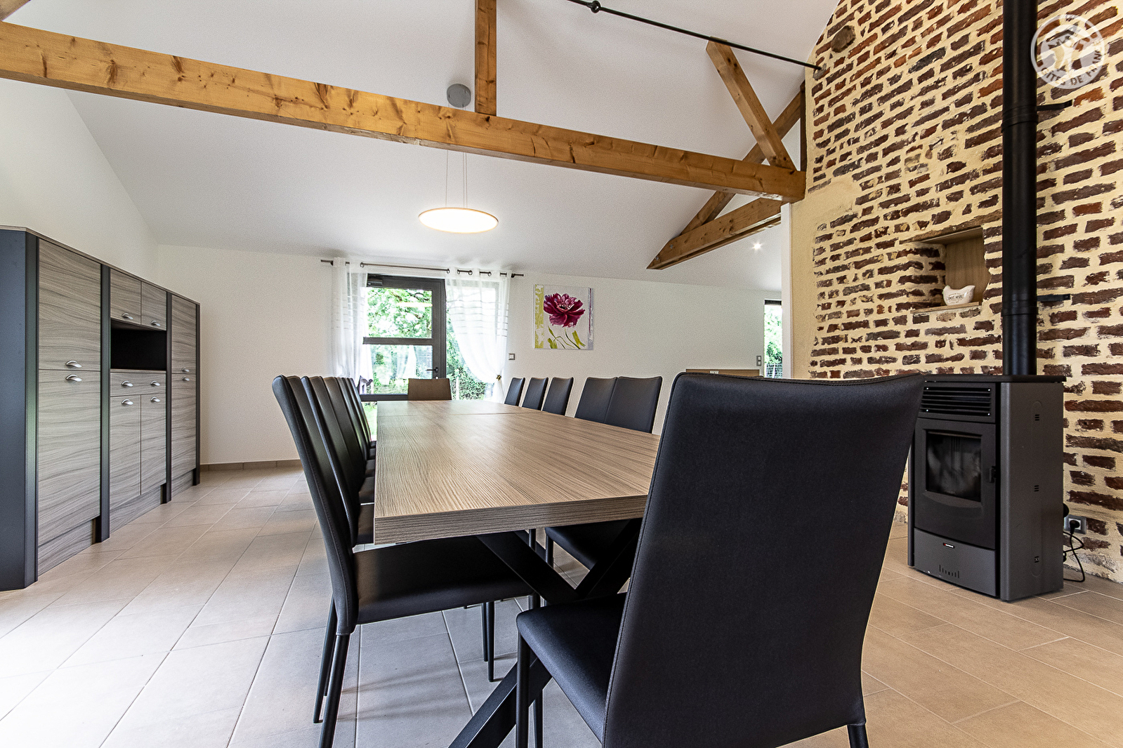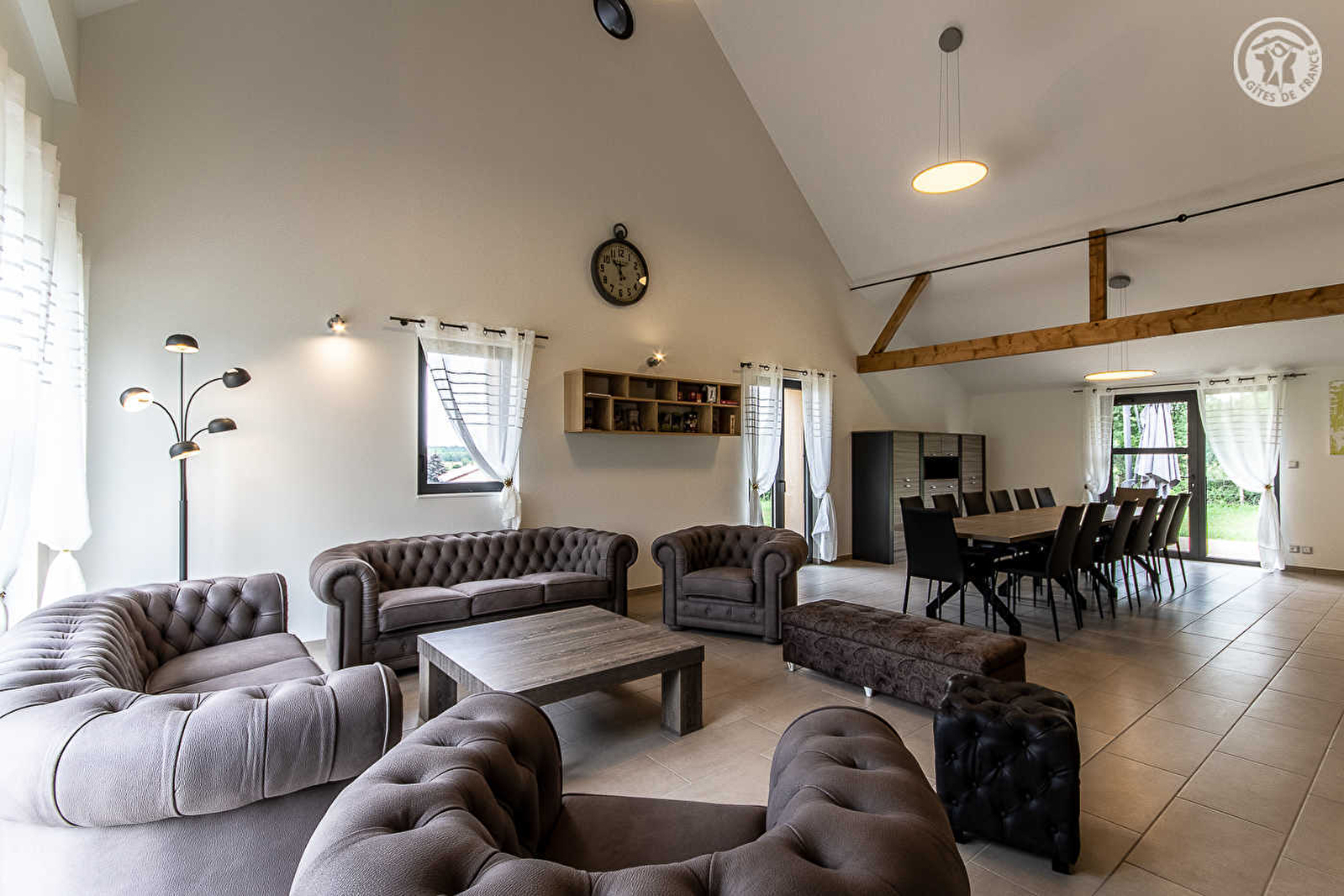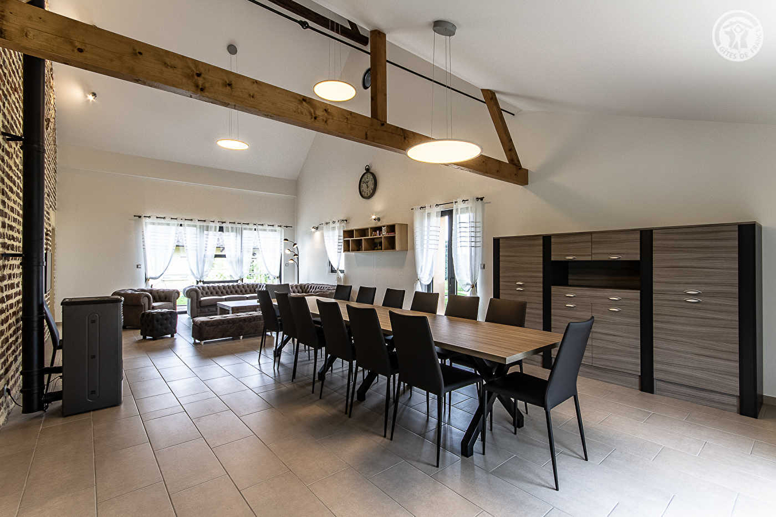 Confortable spacieux gîte de groupe aménagé dans une ancienne grande traditionnelle du 19ème siècle soigneusement et intégralement restaurée par la commune dans un esprit résolument moderne et contemporain (gîte communal). Hameau résidentiel très calme jouxtant le cœur du paisible petit village typique de Torpes niché en pleine campagne bressane louhannaise. Ouvert sur un charmant cadre champêtre et naturel en lisière de champs & prairies, protégé des regards par une barrière végétale arborée. Tranquillité et repos garantis. Vaste terrasse exposée et ombragée ouvrant sur un agréable jardin aménagé (spacieux terrain de foot ou aire de jeux naturelle pour les enfants !). Belle vue dégagée sur la campagne environnante. Gîte de très bon confort. Très spacieux. Équipement complet de qualité. Vaste pièce de vie « cathédrale » au majestueux volume sublimée par l'un des deux authentiques et imposant murs de refend d'origines en briques de pays (structurant le bâtiment). Cachet résolument contemporain, très élégant, marié à une restauration patrimoniale soignée (murs en briques ayant conservé les ravissantes niches et linteaux en bois d'époque, poutres, tringle en métal de l'ancienne écurie…, le tout d'origine). Ambiance zen et douillette.