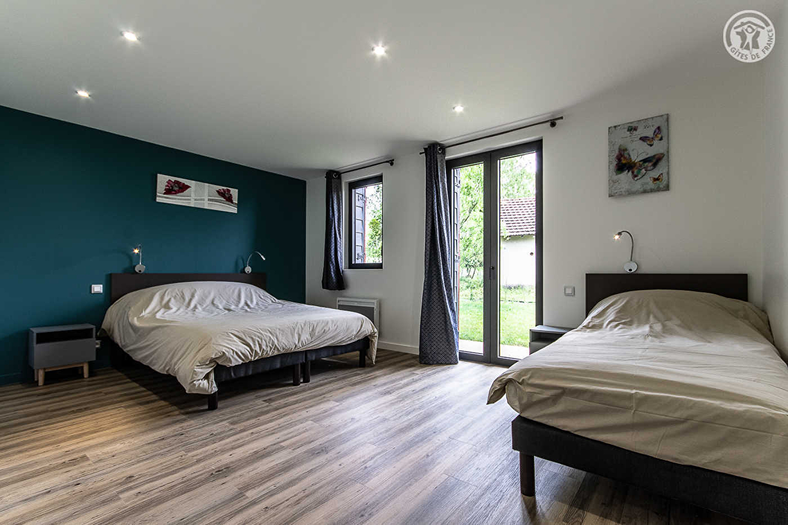 Composition du gîte : Maison individuelle sur 2 niveaux. Wifi. Chauffage électrique + poêle à granulés bois (bois fourni). Rez-de-chaussée : séjour-cuisine-salon, 2 chambres dont une aménagée PMR (lit 2 personnes de 160x200 + lit 1 personne de 90x200cm dans chacune), salle d'eau aménagée PMR (vaste douche), wc indépendant aménagé PMR, réserve-buanderie. 1er étage : vaste chambre dortoir (8 lits 1 personne de 90x200cm), salle d'eau (douche), wc indépendant. Terrasse + jardin + parking privés. Commerces et services 12 km. Gare Creusot TGV 77 km.