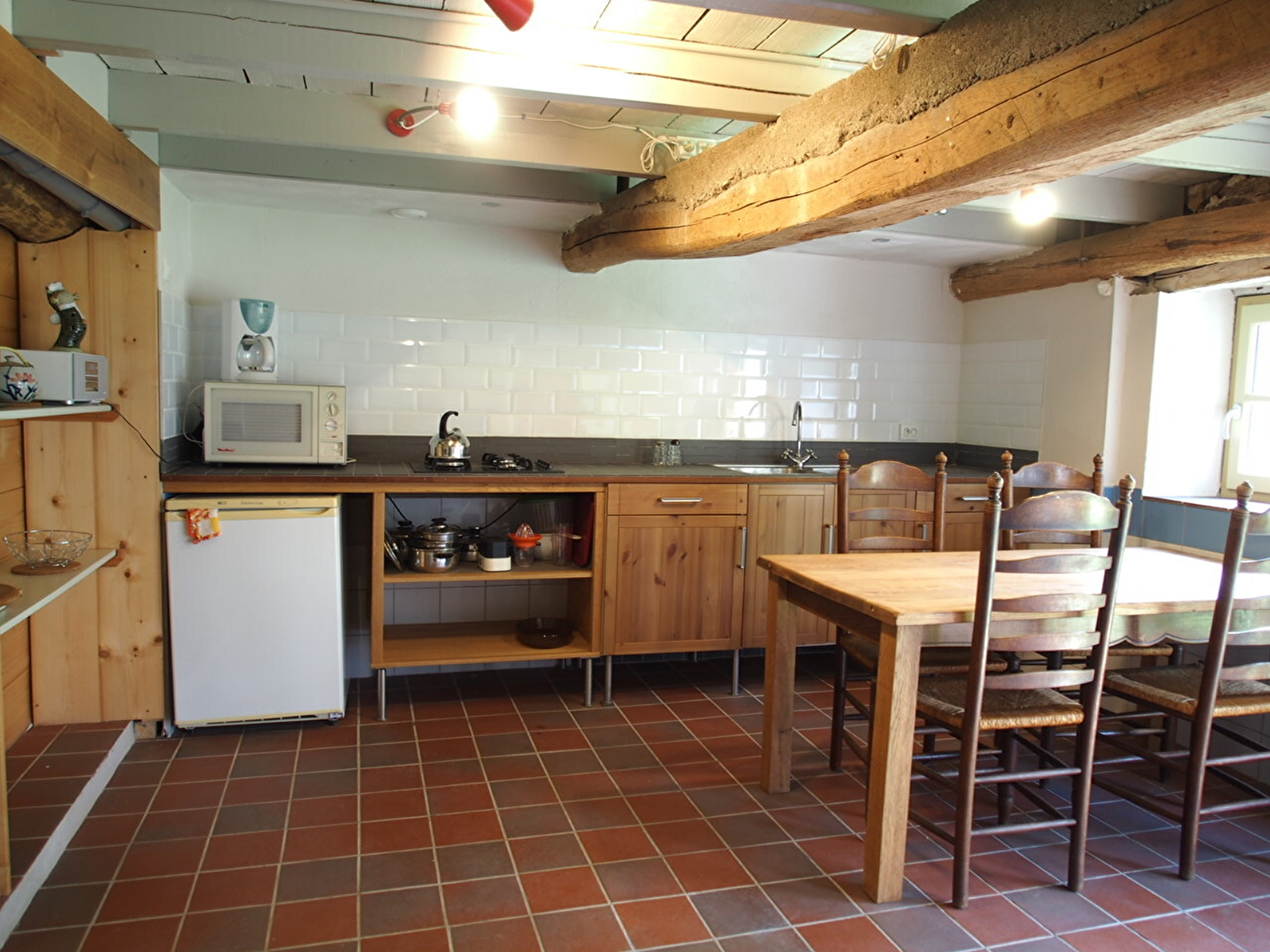 L'entrée se fait à l'ouest du bâtiment, au rez-de-chaussée et donne sur un grand espace cuisine ouvert comprenant également la salle à manger. Tous les équipements nécessaires seront à votre disposition (bouilloire, grille-pain, cafetière, frigo et four micro-ondes). La cuisine possède une grande porte-fenêtre qui donne sur la terrasse avec vue sur le point d'eau et la bambouseraie du domaine, ce qui rendra agréables vos soirées estivales.