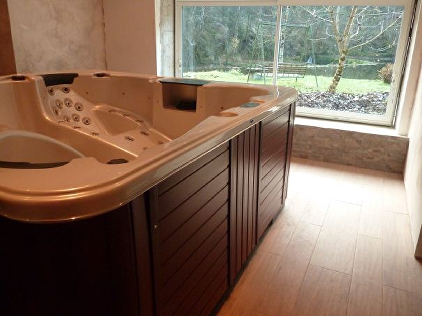 Rez-de-jardin : 1 Spa / 1 Sauna. RC : Salle de séjour (130 m² avec flipper et billard)/Salon - Cuisine équipée/Salon - 3 Chambres - Salle d'eau - WC. 1er étage : Vaste mezzanine avec bibliothèque - 3 Chambres - Salle d'eau - WC - Grande terrasse - Pergola - Terrain non clos avec accès à la rivière.