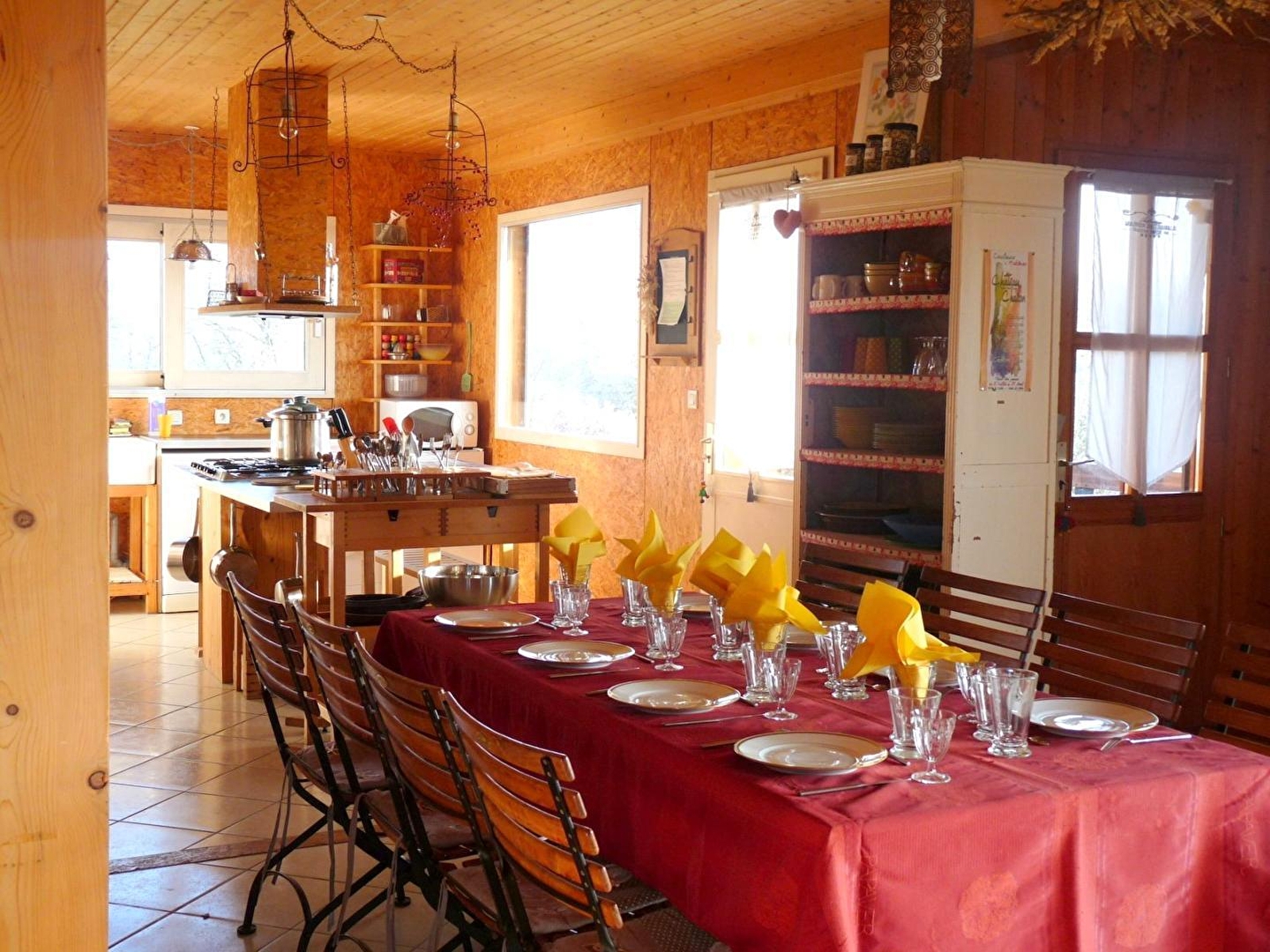 Vous souhaitez une maison indépendante ambiance chalet, chaleureuse et cosy ? Vous avez soif de nature ? Un lieu bucolique vous attend à proximité des sites emblématiques de Baume-les Messieurs, Château-Chalon, Arbois, Poligny et Dole, au cœur du Jura. La Maison des 4 saisons, est conçue pour vous offrir un séjour paisible. Vous disposerez d’un vaste espace de vie au rez de chaussée : lumineux, ouvert sur le sud et la nature à 180°, grand séjour, salon et cuisine. Les chambres sont décorées avec la recherche de mettre en avant un artiste local “Coup de cœur” ! Elles disposent toutes d’un sanitaire privatif (douche, vasque, WC séparé de la salle d’eau), et de lits modulables. Le gîte ouvert sur un jardin arboré, et parfumé dispose d’un balcon-terrasse (25m2) au sud, très apprécié pour la convivialité autour de bons apéros ! Inscrits dans une démarche de respect de l'environnement, nous avons aménagé un jardin d'agrément en biodiversité. A votre guise vous pourrez observer, écouter, sentir, la visite est offerte pour les séjours prolongés. Notre gîte est labellisé « Vignobles & Découvertes », et est qualifié Ecogestes et Biodiversité. Possibilité d’un accueil jusqu'à 15 personnes avec 2 chambres indépendantes situées 30m du chalet, sauf du 15 novembre à mars. Préférence location week-end (minimum 3 nuits pour jours fériés et saison estivale), séjours de 7 nuits et plus sur demande. Week-ends à thème (oenotouristique, sensoriel) avec la Bulle à Parfums sur place. Accueil de randonneurs (pédestres, cyclos, motards).