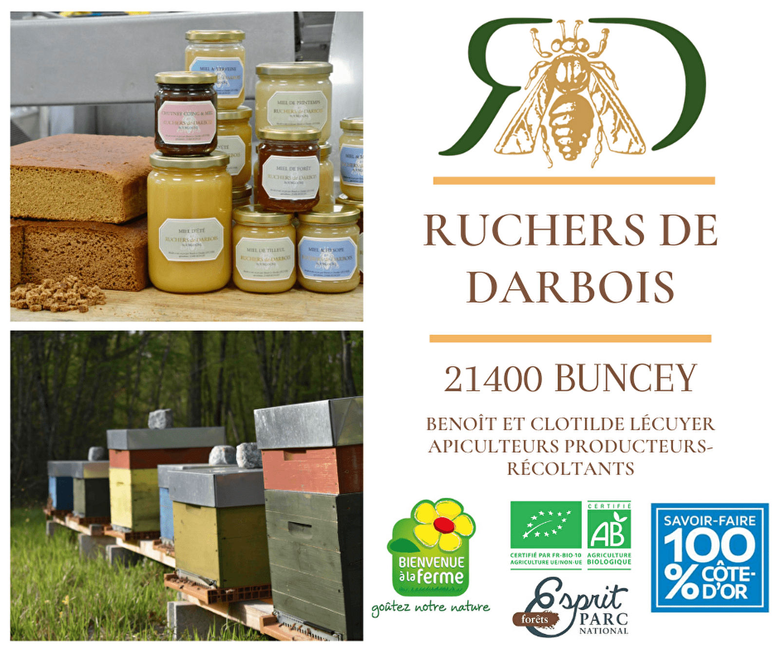 Située à 1.5km de Châtillon-sur Seine, Benoît et Clotilde accueillent à la miellerie pour visiter, déguster ou acheter les produits de leur exploitation professionnelle en apiculture biologique.