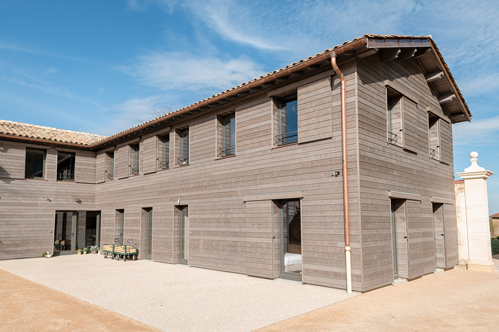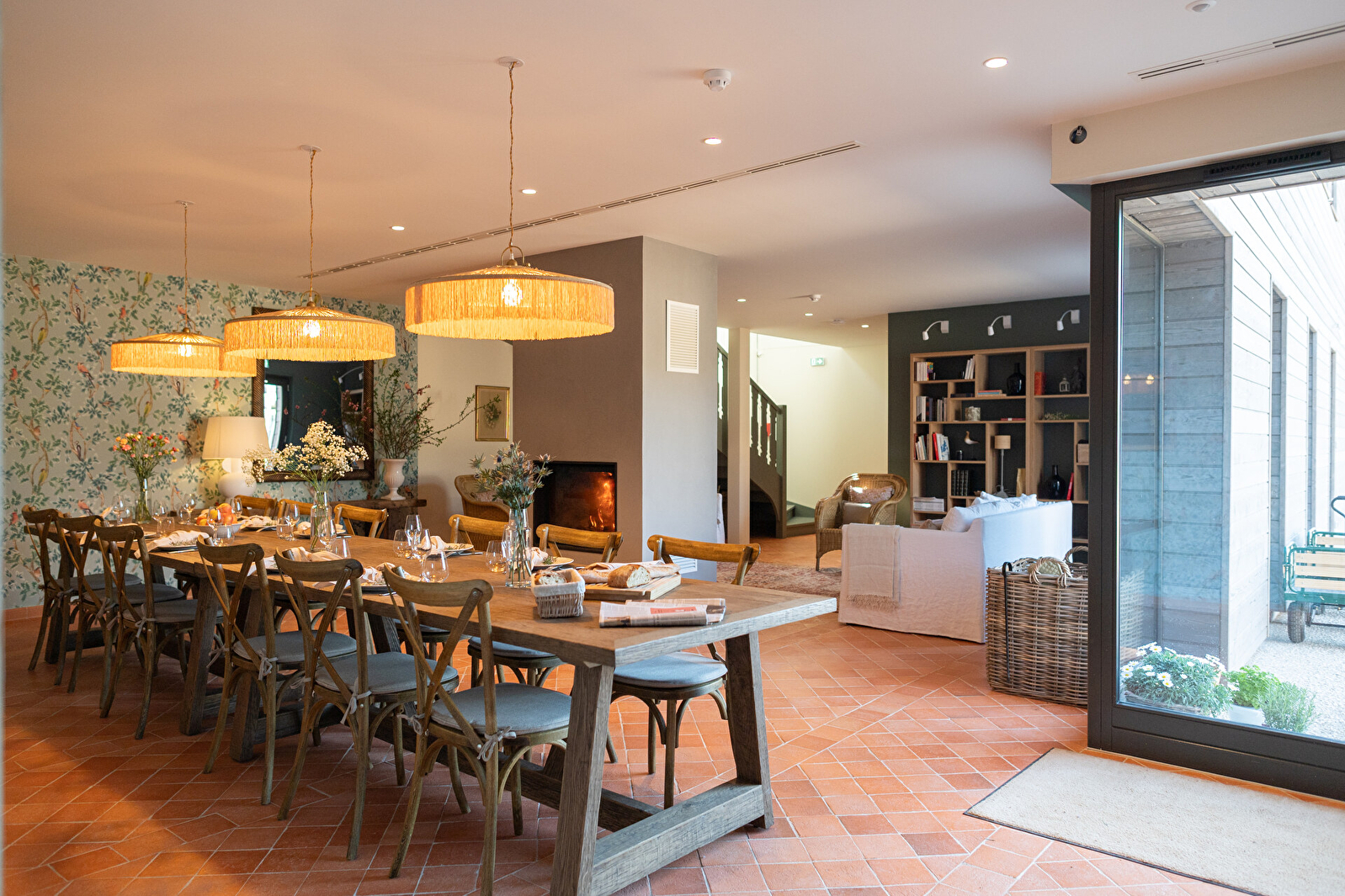 Au rez-de-chaussée, tous les éléments sont réunis pour partager des moments conviviaux : une cuisine avec son ilot central ouverte sur le séjour, une grande table pour 20 personnes, et le coin salon avec fauteuils et canapés. Au centre de la maison, se trouve la cheminée qui apporte douceur et chaleur par temps froid.