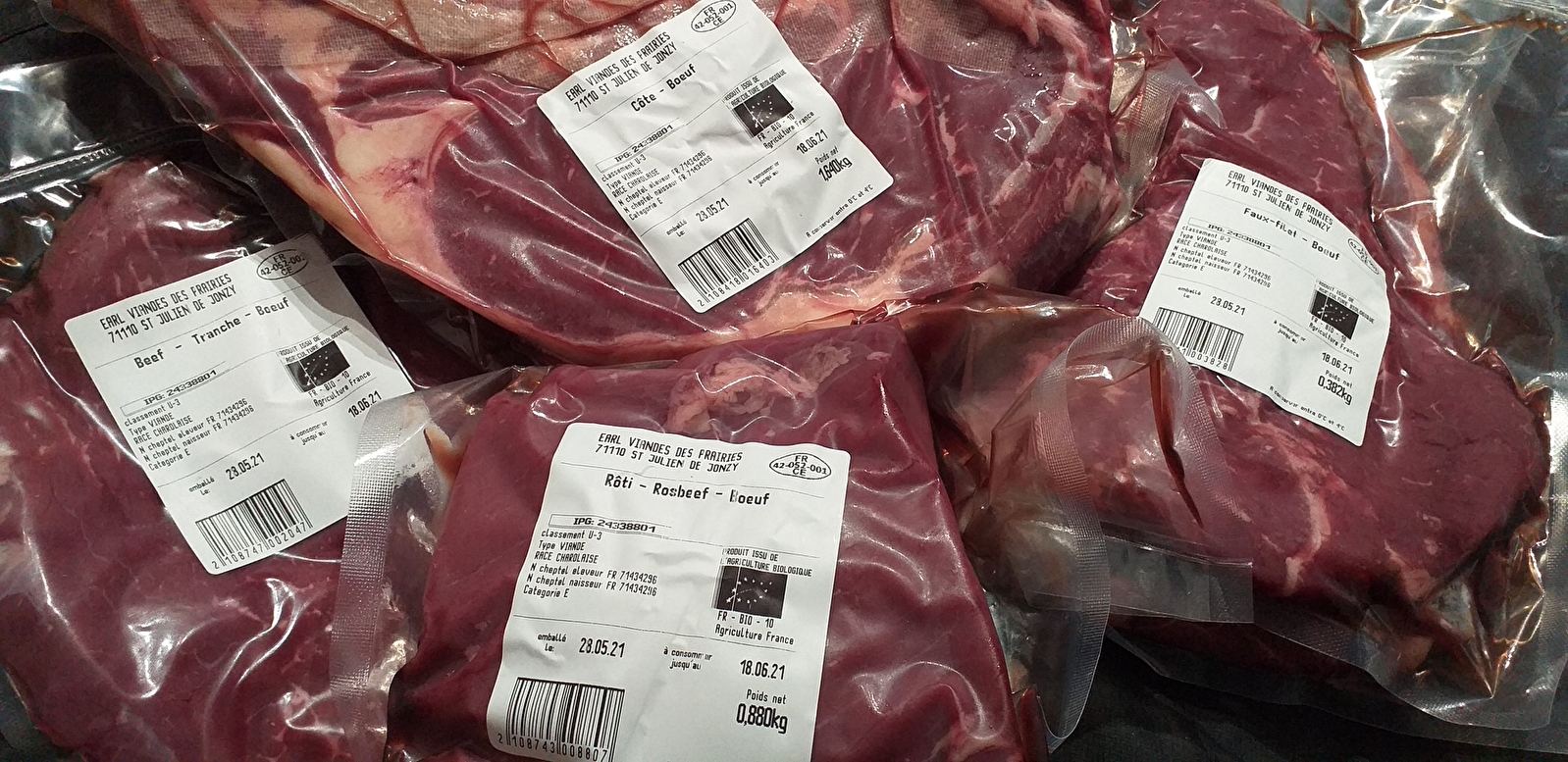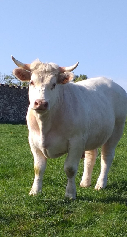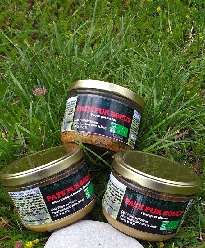 Nous proposons notre viande de bœuf BIO de race charolaise ou limousine en vente directe à la ferme. Nous produisons notre viande de bœuf en respectant le cahier des charges de l'Agriculture Biologique (absence d'engrais, de pesticide, soin aux animaux, bien-être...). Nos animaux pâturent sur nos prairies naturelles certifiées en Agriculture Biologique. Vous trouverez nos produits en vente à la ferme : steak haché surgelé, terrine de bœuf, plats cuisinés, saucisson sec pur boeuf... et sur commande : viande fraiche emballée sous vide. Nos produits sont également présents dans différentes boutiques de produits locaux et produits BIO... Renseignez-vous...